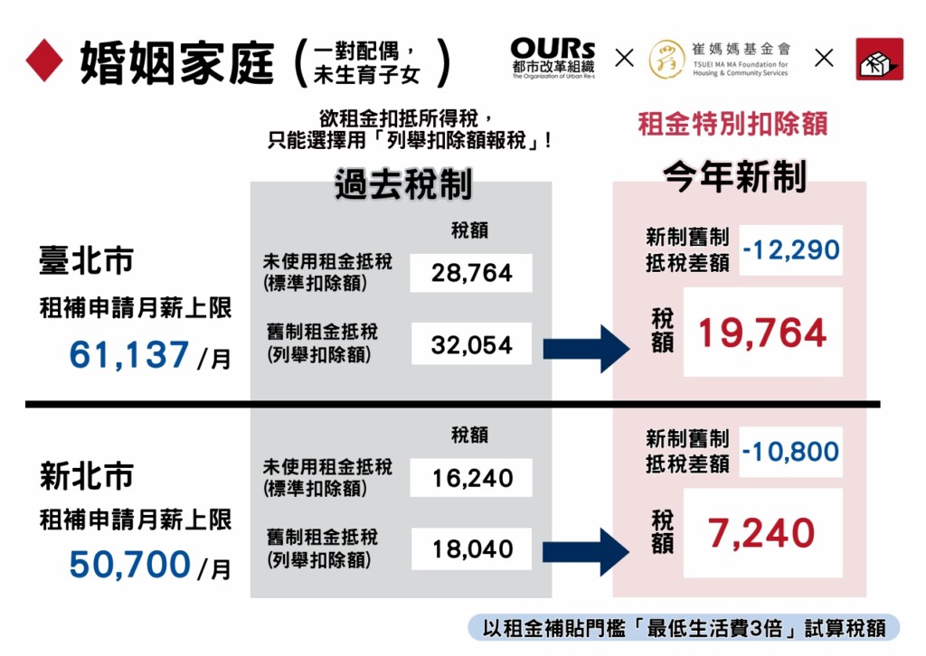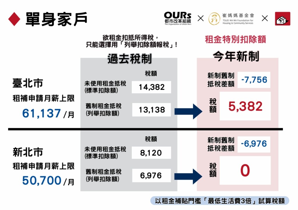 而今年即將上路的租金抵稅新制,則改為可以與標準扣除額共同使用的「特別扣除額」並提高額度。對於前述租屋族而言,單身租屋族將可比舊制省下4,528-7,756元稅賦;而家庭租屋族則可少10,800-12,290元,提升租金抵稅制度對於租屋族的實際幫助。