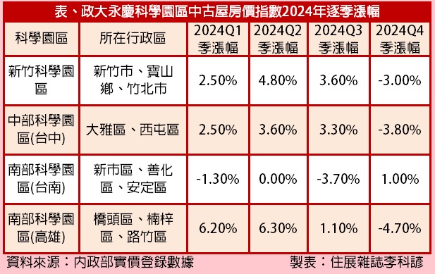 根據最新公布的「政大永慶科學園區中古屋房價指數」,2024年第四季科學園區房價出現明顯修正。其中,高雄科學園區周邊房價季跌幅達4.7%,成為此次跌勢最顯著的區域;此外,中部科學園區與新竹科學園區房價分別下跌3.8%與3.0%,顯示全台科學園區房市皆受到壓力。
