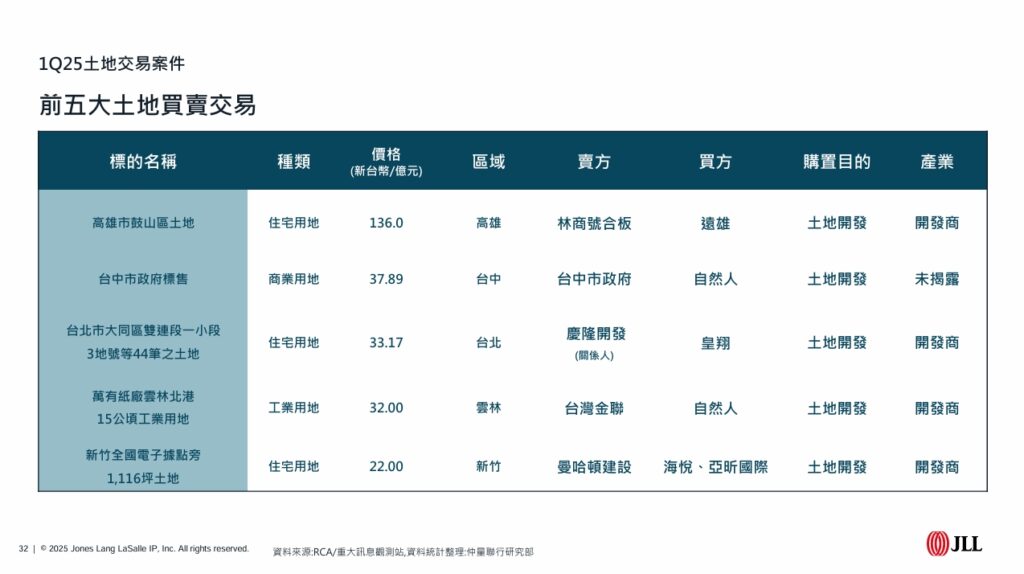 2025年Q1前5大土地買賣交易,資料來源:仲量聯行