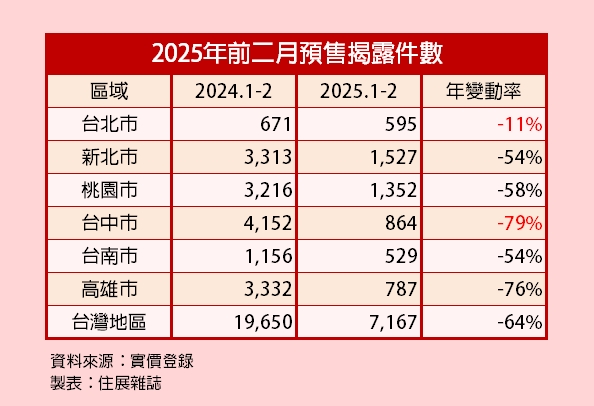 根據實價登錄統計,台灣地區今(2025)年前二月預售屋僅成交7,000餘戶,不僅年減約6成,更創同期近5年來新低。各縣市以台北市的交易量相對穩健,年減僅約1成;台中市則較劇烈,年減將近8成。