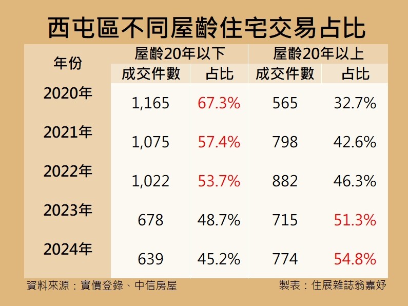 目前西屯區屋齡20年以上中古屋交易占比高達54.8%、創歷史新高,成交價約為每坪27.8萬元,相較於2020年同期的每坪18.2萬元,短短5年時間就大漲9.6萬元、漲幅52.7%;反觀屋齡20年以下成屋的房價漲幅只有32.4%。