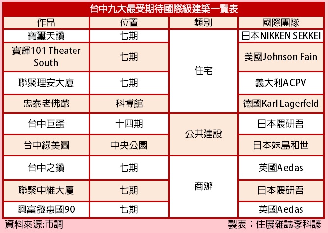 台中以國際建築設計密度之冠聞名,如今更是再突破自我,迎來包括『寶璽天讚』、『寶輝101Theater South』、『聯聚理安大廈』、『忠泰老佛爺』、『台中之鑽』、『台中巨蛋』,以及『台中綠美圖』等等九大最受期待的國際級建築新作,將鞏固台中「全台國際建築密度最高城市」的領先地位。