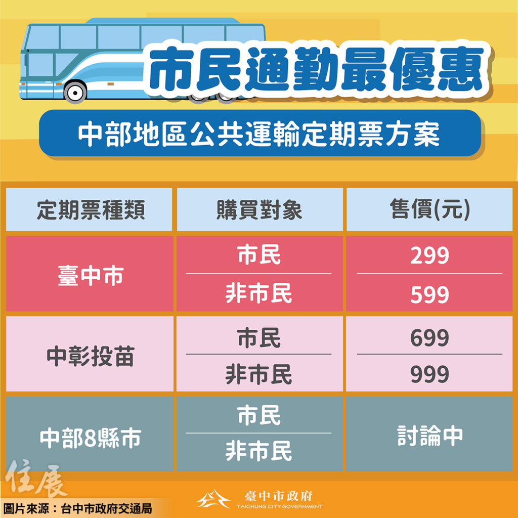 葉昭甫也說,為儘速讓民眾享有優惠,台中市第一階段將推出市境內套票,可使用於台中市公車、捷運與公共自行車,市民299元;非市民599元,台中、彰化、苗栗、南投的小聯盟區域套票,可使用範圍內台鐵、捷運、公車、公路客運與公共自行車,台中市民699元;非台中市民999元。