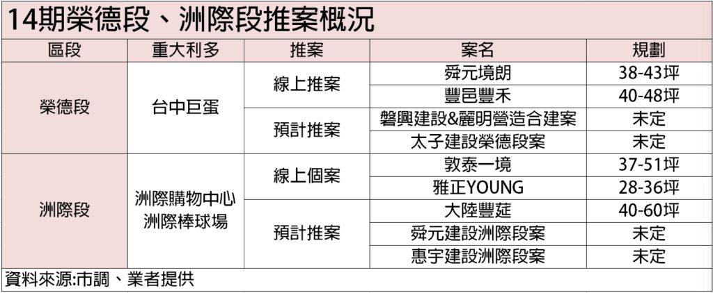 元宏不動產加值服務平台研究總監陳傑鳴表示,14期前2年推案多集中在仁平段、美和段、敦和段,從4字頭一路衝上6字頭,而推案較緩的洲際段、榮德段反而擁有巨蛋及洲際商城兩大14期最強利多,接連發包、動工後,價值性也漸漸浮現,具有補漲空間,各大建商積極布局,將可能重塑14期價格天花板。
