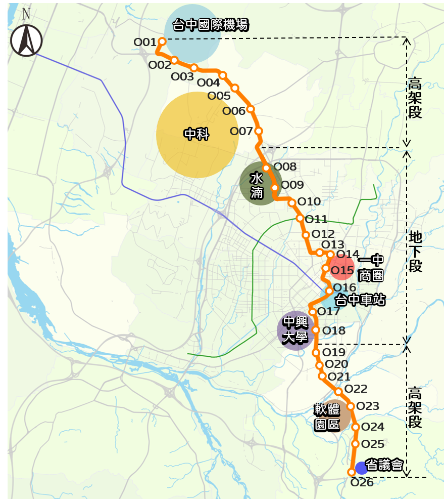 其中,針對地方關注的機場捷運(橘線),該路線起自台中國際機場,行經水湳經貿園區、一中商圈、台中車站以及台中軟體園區等地,終至霧峰區省諮議會附近,全長29.2公里,車站規劃高架15座、地下11座共計26座。