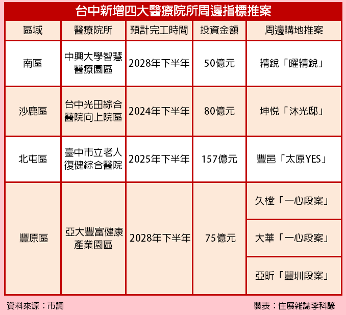 單就台中部分,南區、北屯區、沙鹿區、豐原區等行政區都將新增醫療院所,完工後預計可帶來上萬個就業機會,特別是醫師類的高收入群體對於居住需求增加,有望帶動區域房市進一步發展,更吸引精銳、久樘、豐邑、國聚、茂洋、大華、亞昕等建商購地推案。