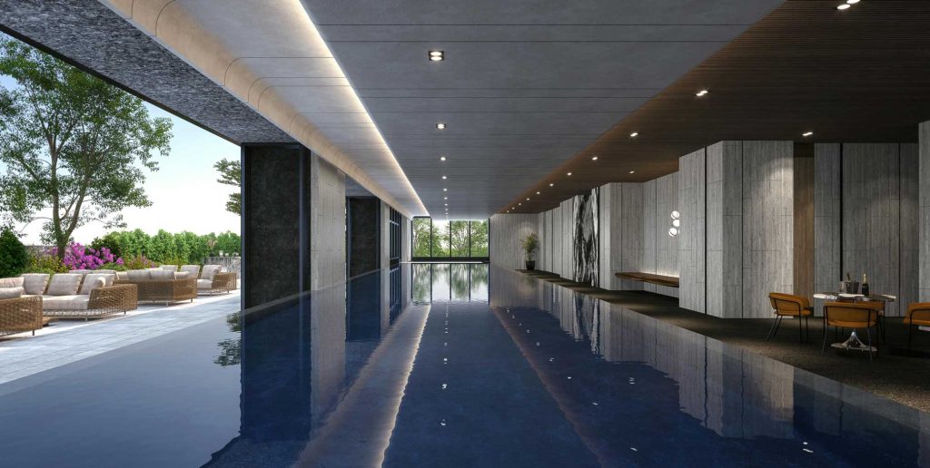 漢宇建設『雲衍 SKY VISION』擁有連通室內外的25米四季溫水泳池。圖為3D示意參考圖。圖/漢宇建設提供