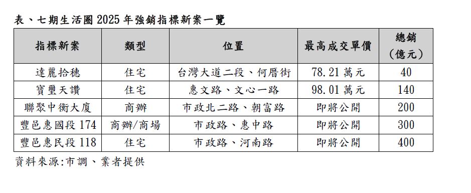 除住宅外,商辦與大型開發案亦全面啟動,聯聚建設推出37層「聯聚中衡大廈」,產品規劃60至130坪彈性格局,總銷約200億元;豐邑集團在市政路、惠中路口推出53層摩天大樓案,下層為自營百貨,上層為70坪以上辦公室,總銷上看300億元;另外在河南路口基地達2,500坪的案子,規劃住宅與辦公雙軌,總銷上看400億元。