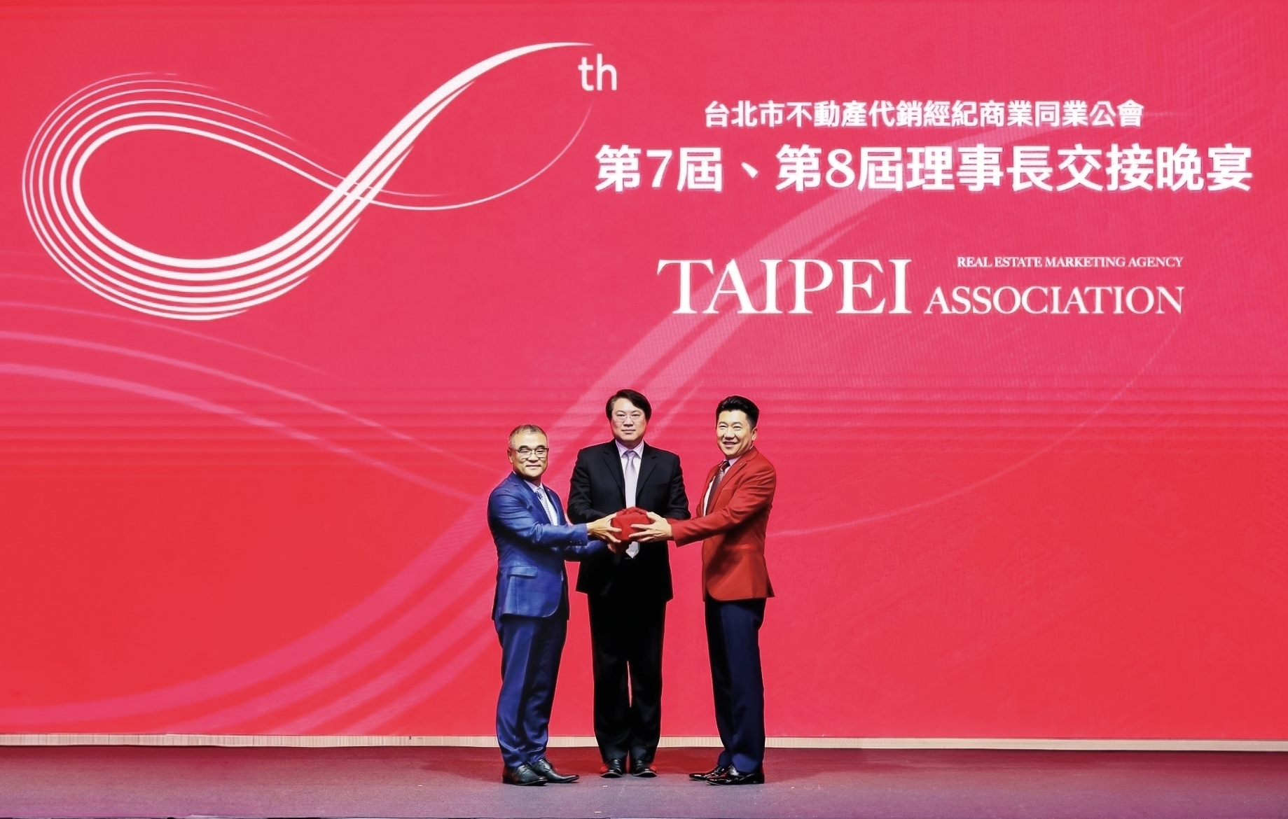 成立將屆滿22年的台北市不動產代銷公會6月9日晚上舉行第七屆、第八屆理事長交接儀式,內政部長林右昌主持監交見證,卸任理事長海悅國際總經理王俊傑將印信交付創意家行銷董座王明正,正式由王明正接棒新任理事長。