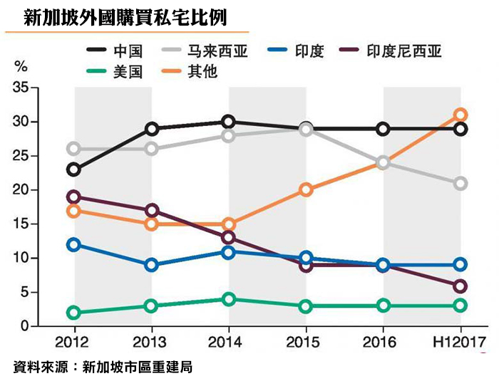 中國買家向來傾向投資在海外市場,表現一種身份的象徵,而新加坡中雙語的親切環境感到青睞,所以看中當地的房地產,在今年上半年購買新加坡私宅的外國買家比以往更多元化,包括香港、韓國、臺灣和英國的投資者。