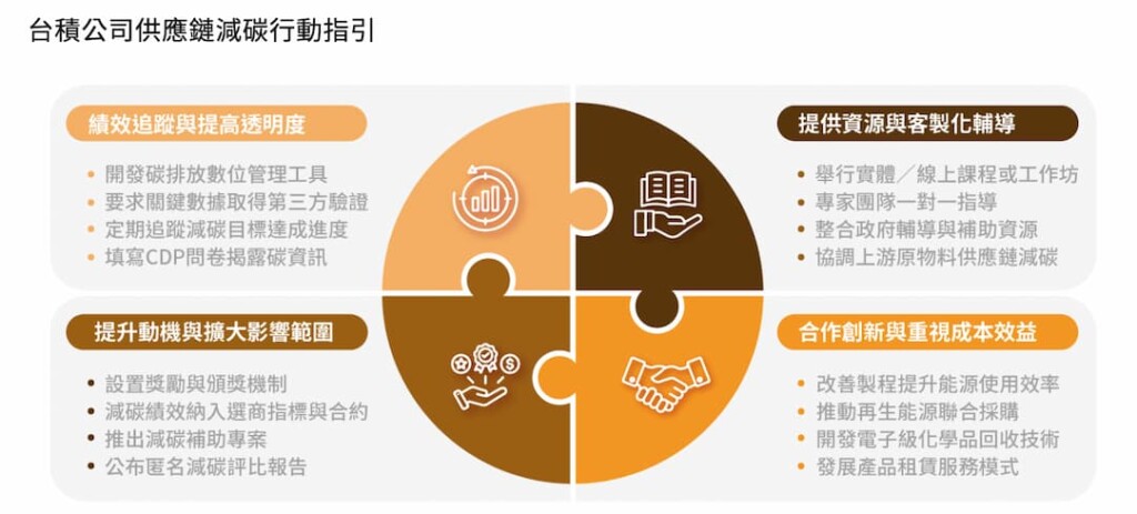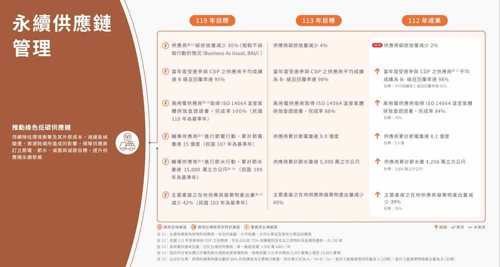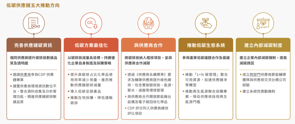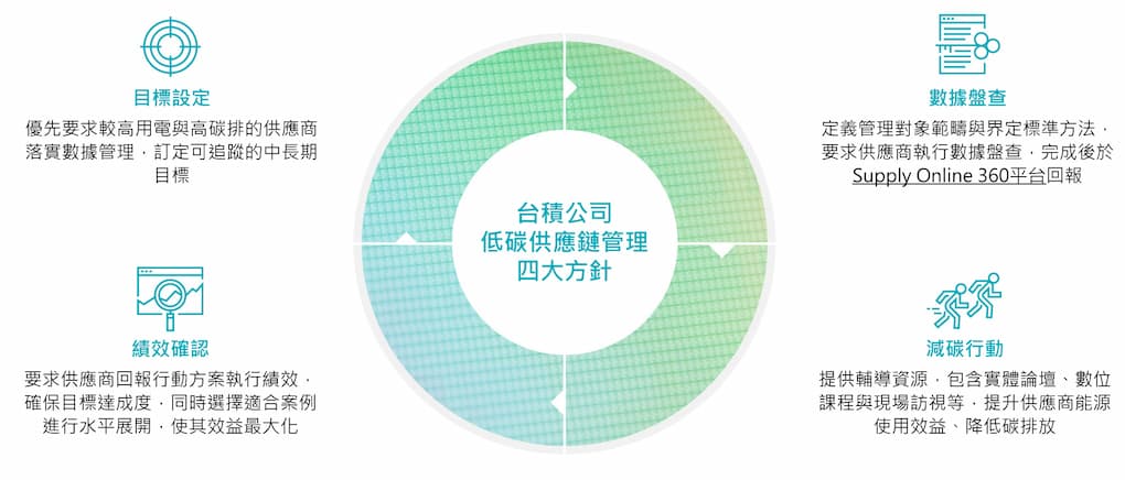 台積電透露,將以「完善供應鏈碳資訊、低碳方案最佳化、與供應商合作、推動低碳生態系統、建立內部減碳制度」五大方向引導供應商落實低碳管理,公司將減碳目標與成果納入選商評估,並要求關鍵排放源供應商定期共同檢討減碳進度,並提出具體減碳計畫。供應商須於每年指定期限前提交新年度及中長期計畫,確保減排成果符合預期並持續改進。