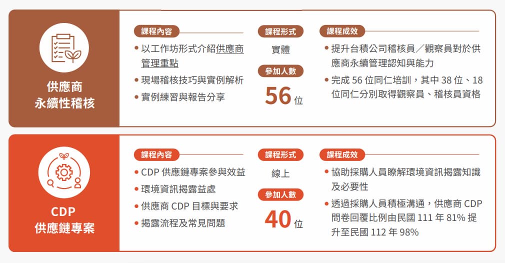 同時,台積電也透過工作坊培養供應商碳盤查能力,例如「溫室氣體盤查」、「產品碳足跡盤查」主題工作坊,由專業講師將複雜的盤查過程進行拆解說明,引導供應商專責人員正確鑑別廠房、產品的碳排放來源與數據計算,進而規畫改善作為達成減量目標;又或者,與經濟部工業局合作推動節能減碳輔導計畫,精進供應商節能減碳能力。據悉,2022 年有 18 間參與計畫,當年總計節電 290 萬度、減碳 1,400 公噸。
