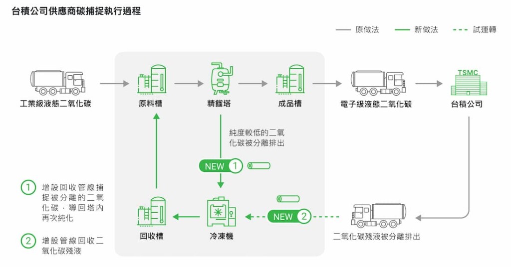 台積電也已啟動「供應商液態二氧化碳之碳捕捉計畫」,鼓勵供應商透過改造精餾塔塔頂的管路,增設回收管線捕捉被分離的二氧化碳,將其導回塔內進行再次純化,同時搭配製冷效果更佳的冷凍機優化提純效率至90%以上;亦建議供應商針對其回廠槽車設計「二氧化碳殘液回收系統」,增設管線將槽車內殘餘的液態二氧化碳回收,再進入原料槽重新導回精餾塔進行二次純化。