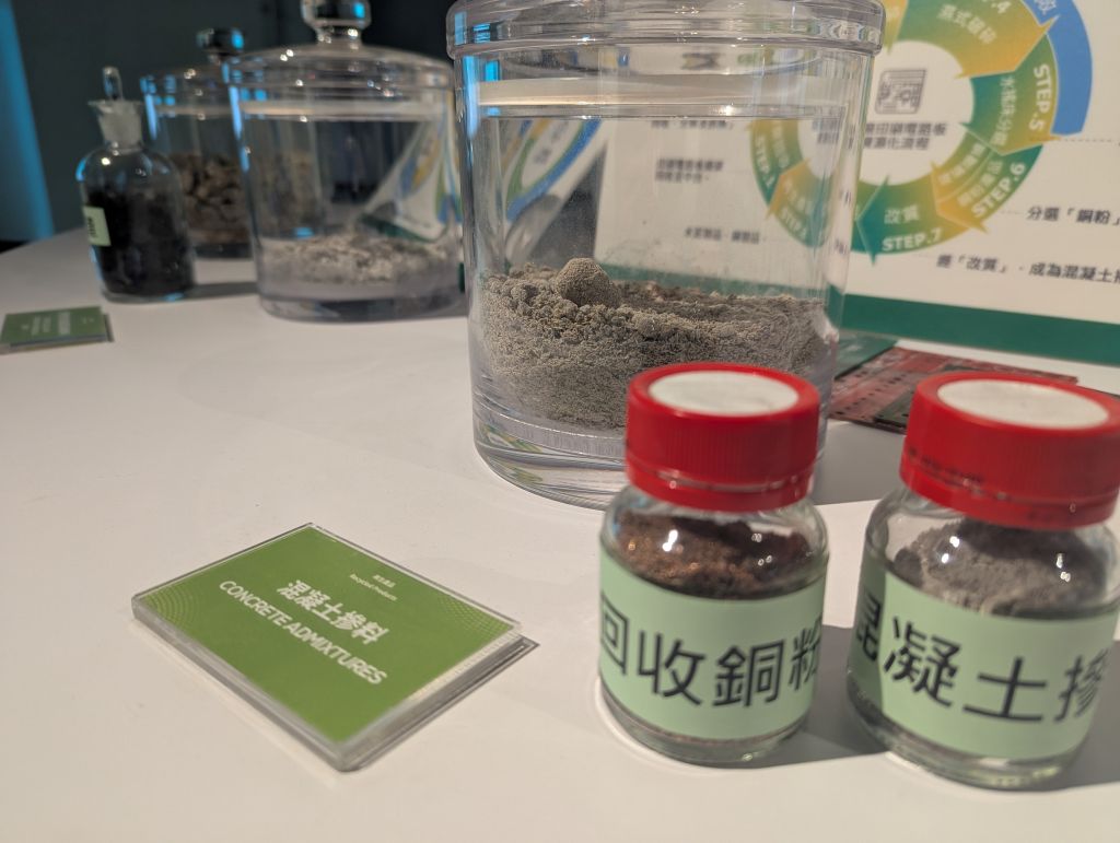 除了進行廢燈管的回收之外,張啓達還指出,針對電子廢棄物中富含的銅金屬,中台資源科技利用其三廠進行物理性破碎和濕式分選,資源的回收率可達 99%。而分離後的玻璃纖維則進一步改質,製成混凝土摻料,應用於土木工程,實現百分之百全循環的目標,是一個全循環的,零廢棄的一個製程。