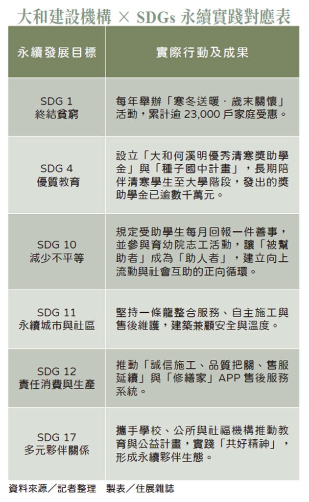 何溪明讓建築回到人的起點,也讓善意延伸成為一種文化。那是「逆風築夢」的力量,更是永續傳承溫暖的見證。在這條從教育到建築、從公益到共好的人生路上,他以實際行動回應了聯合國永續發展目標(SDGs)所倡導的精神——讓成長、平等與關懷,成為企業永續最堅實的基礎。