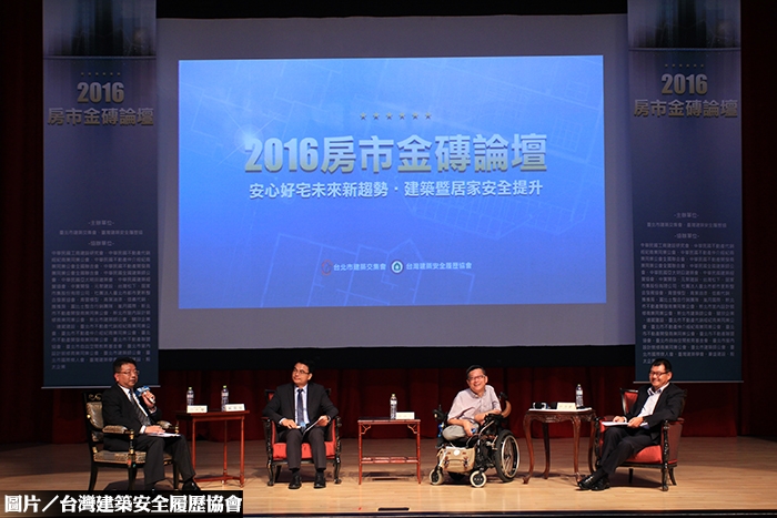 【住展房屋網/台北報導】由台北市建築交集會主辦,已經進入第七屆的「2016房市金磚論壇」8/30於中油大樓國光廳盛大舉行!現場與會嘉賓眾多,出席率更逾七成。2016論壇以「建築安全」為出發,將主題訂為-「安心好宅未來新趨勢․建築暨居家安全提升」,並邀請到台灣建築安全履歷協會理事長戴雲發、自由空間教育基金會董事長唐峰正、中興保全新建築事業處處長何沛軒開講。