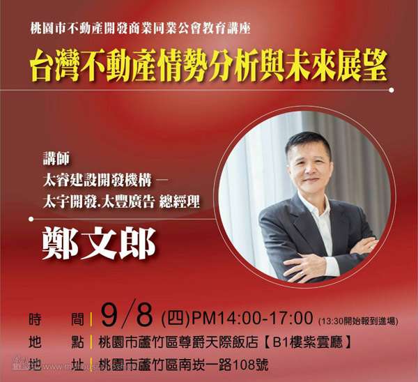 桃園不動產開發同業公會今(9/8)下午2時起舉辦「台灣不動產情勢分析與未來展望」講座,由太豐廣告鄭文郎總經理主講~