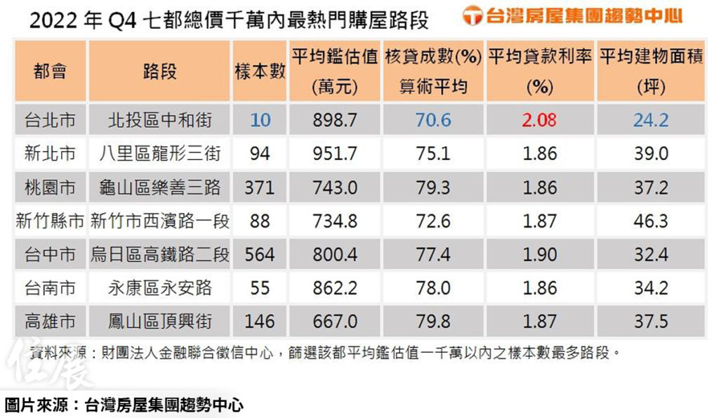 對於預算不到1000萬的買房者而言,在七大都會區能夠找到的選擇相對有限。台灣房屋根據聯徵中心去年Q4的申貸資料,以平均鑑估值1000萬為上限,找出七大都會區申貸樣本數最多的低總價熱門購屋路段,其中台北市僅有位於北投區的中和街達標,且樣本數僅10件,顯示首都總價千萬內的區段與物件相當有限。