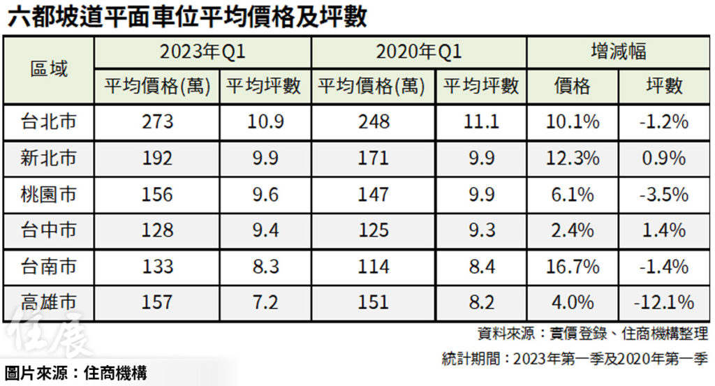 近日內政部長林右昌宣布將推行虛坪改革,優先處理大家最關注的車道、停車位問題,並預計於6月時提出方案,掀起車位大小及價格的廣泛討論。依實價登錄資料,觀察2023年第一季六都坡道平面車位的均價與平均面積,與三年前同期比較,價格全體上漲。尤其台南市價格這三年來成長16.7%,平均一個平面車位133萬元輾壓台中市;不過車位面積各有增減,以台北市平均面積10.9坪最大,南二都車位平均面積都不到9坪。