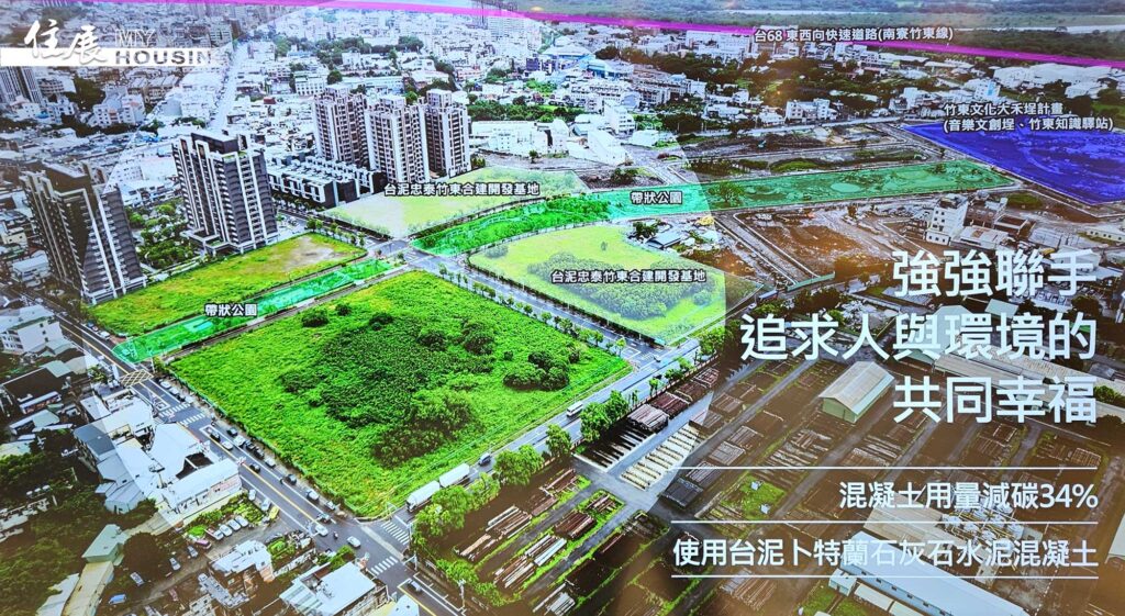 台泥為活化新竹縣竹東鎮舊廠,共分3期開發,首批釋出約6,508坪的土地,與忠泰建設推合建案,預估此開發案建物面積25,078坪,共分2區,總銷金額預估達90億元,鎖定竹科首購族,規劃坪數多元的住宅產品,部分低樓層為商用空間,最快明年下半年登場,2025年正式公開,預計2028年完工。