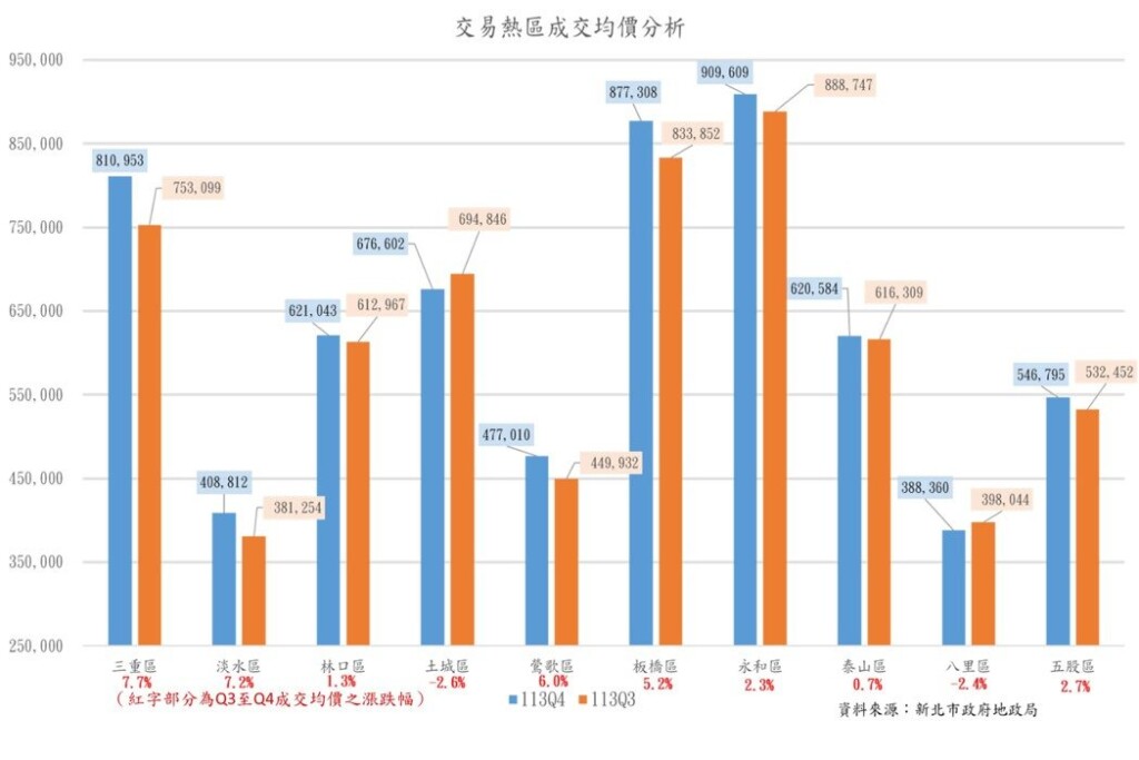另分析交易熱絡行政區,成交均價永和區91萬元居首,板橋區及三重區分別以87.7萬元、81.1萬元緊追在後,其次為林口區、土城區、泰山區及五股區,每坪單價54.7萬元至67.7萬元,最後則為淡水區、鶯歌區及八里區每坪成交均價38.8萬元至47.7萬元。