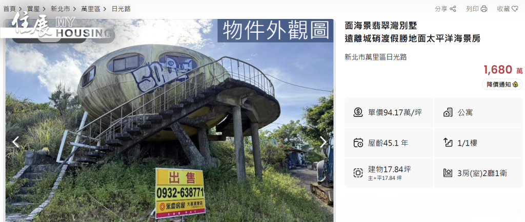 一棟曾被稱作「未來住宅」的海邊飛碟,如今在荒草間掛上「出售」告示。位於新北市萬里區翡翠灣的「太空玲瓏屋」近期登上房仲平台,開價高達1,680萬元,主打海景與稀有造型。這座屋齡45年的玻璃纖維建築,當年以「太空、未來、現代化」為賣點,如今卻因屋況老化、法規模糊與市場買氣低迷而成冷門標的。專家提醒,該區空屋率高達29.83%,若以投資角度進場,「入場門票不低、退場難度更高」。