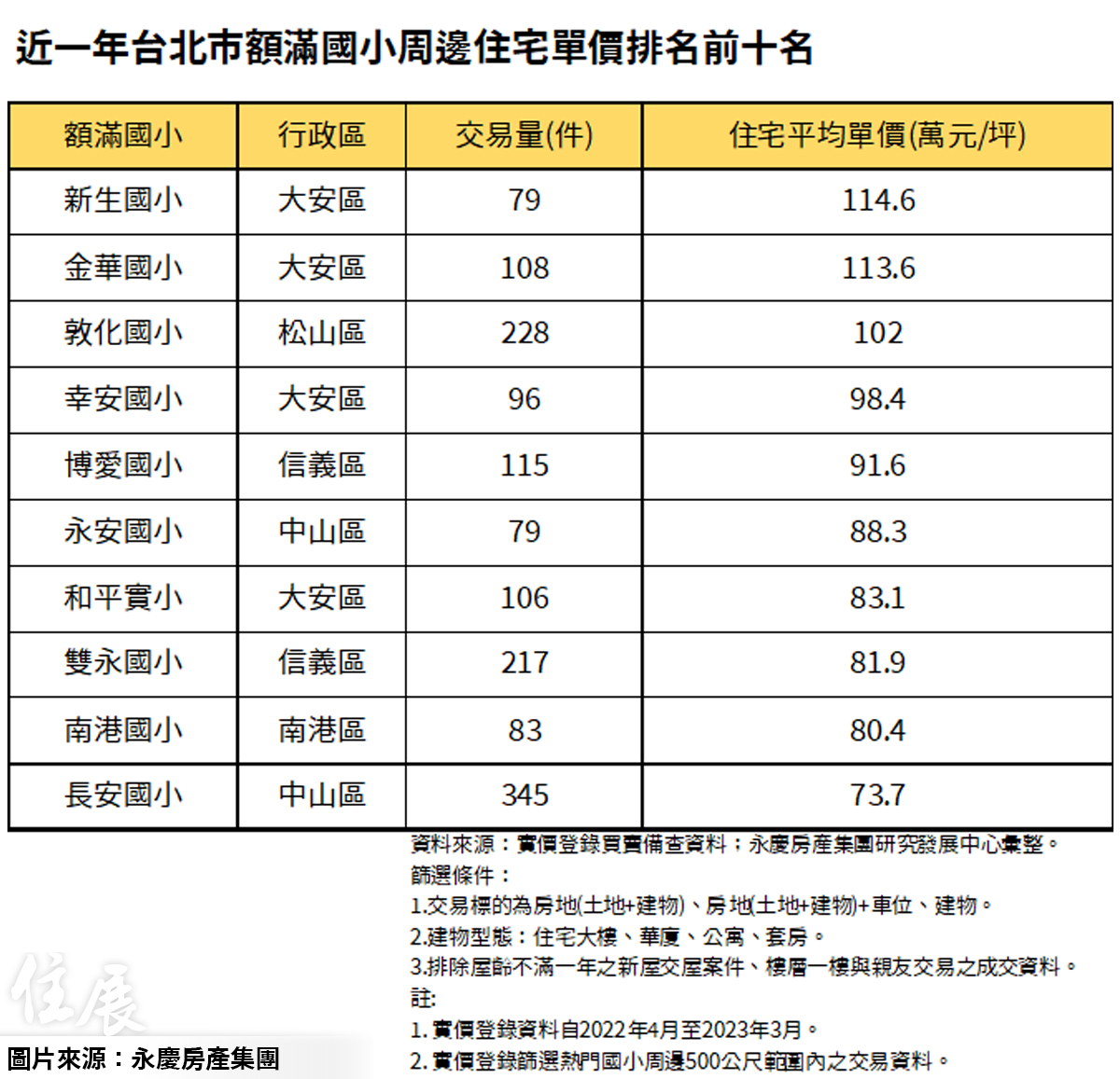 永慶房產集團根據實價登錄資料,統計台北市25所需辦理入學審查的額滿國小周邊房市,其中房價最高的前十名中,大安區有4所國小入列,堪稱一級戰區。而「新生國小」、「金華國小」、「敦化國小」周遭住宅單價均已突破百萬大關,要價不斐!