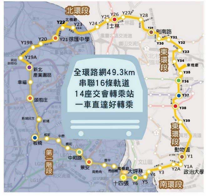 捷運局補充,南北環及東環段的逐步推進所形成的環狀網路,日後將肩負連結既有捷運路網的任務,透過14個轉乘站,連接高鐵、台鐵等,串連成16條輻射軌道路線,為旅客帶來連線成環、四通八達的願景。