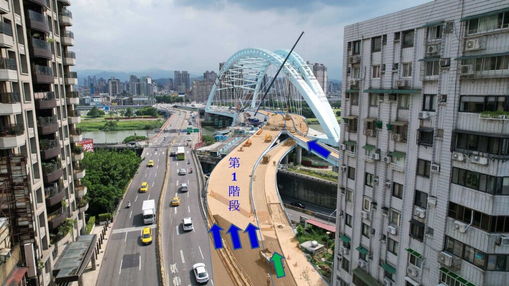 新工處表示, 10月8日舊橋原有3車道有2車道改道新橋,仍保留舊橋1車道直行往永和方向的通行方式,以便施作新舊橋結構重疊部分,目前該部分新橋結構作已近完成。