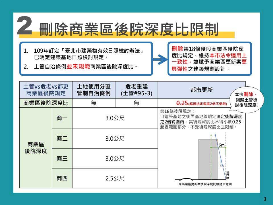 對於「放寬商業區都更案後院深度比」部分,都更處指出,刪除原自治條例第18條針對商業區後院深度比的規定,直接適用《台北市土地使用分區管制自治條例》的規定,可避免法規疊床架屋,也可增加商業區都更規劃的彈性。