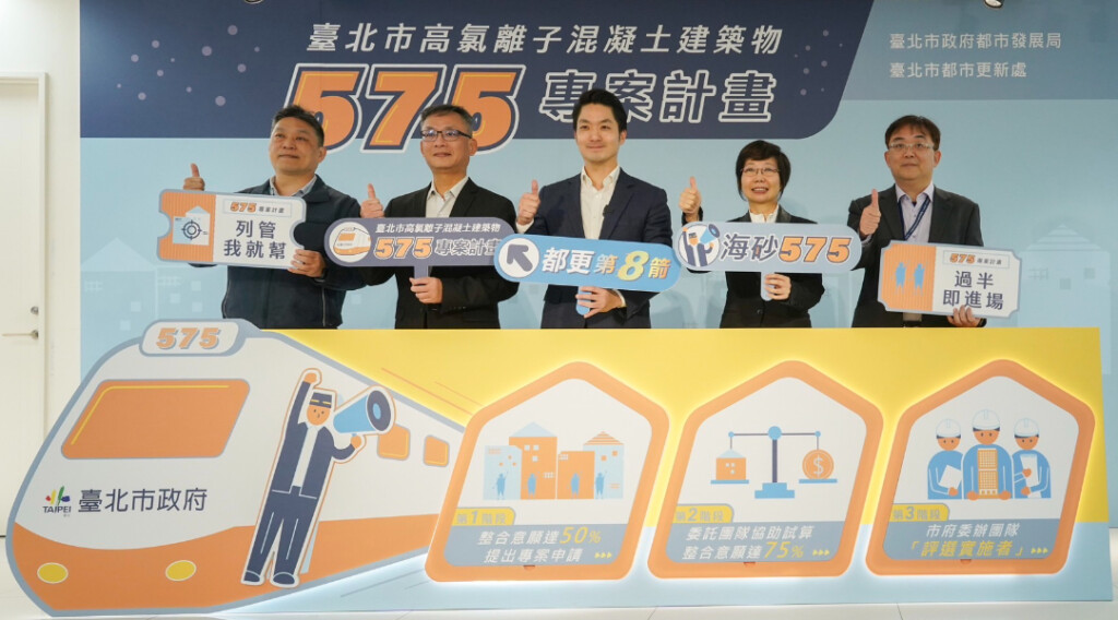 台北市長蔣萬安於今(4)日召開記者會公告實施「台北市高氯離子混凝土建築物575專案計畫」,針對海砂屋重建機制新增「公辦都更」,以專案方式提供建築及財務試算,協助儘速重建,目前列管可立即適用者有33件。