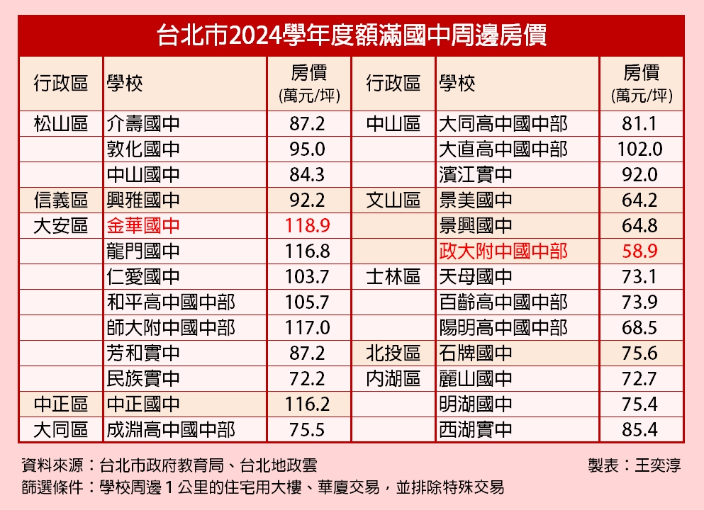 彙整台北市政府教育局、台北地政雲資料,顯示2024年額滿國中周邊房價,以金華國中學區宅居冠;相較之下最親民的,則是政大附中國中部的學區宅。
