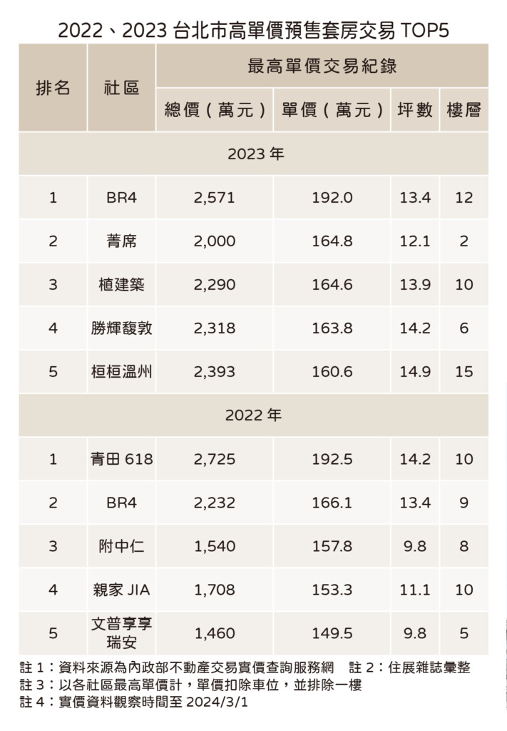 此外,再看前五強的高單價套房走勢,2023年最高價碼達單坪192萬元,為捷運忠孝復興站旁的『BR4』,交易坪數僅13.4坪,其餘前四名分別為『菁席』、『植建築』、『勝輝馥敦』、『桓桓溫州』,單價在160.6至164.8萬元,坪數則是12.1至14.9坪。