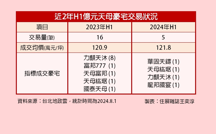 台灣房屋集團趨勢中心觀察,截至上半年,今年天母地區的億元豪宅交易筆數共有5筆;相較之下,去(2023)年同期則有16筆,包括8筆來自新完工豪宅『力麒天沐』。平均成交單價方面,則已今年上半年的121.8萬元/坪,較去年同期的120.9萬元微增0.7%。