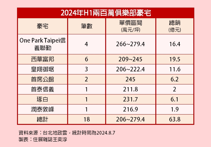 台灣房屋集團趨勢中心觀察,今年上半年單價200萬元/坪的豪宅交易已有18筆,比去年多出6筆。其中共有7棟豪宅入榜,包含6筆『西華富邦』、4筆『One Park Taipei元利信義聯勤』、3筆『皇翔御琚』、2筆『首席公館』,以及『首泰信義』、『琢白』、『潤泰敦峰』各1筆,上半年200萬俱樂部總銷累積逾63.8億元。