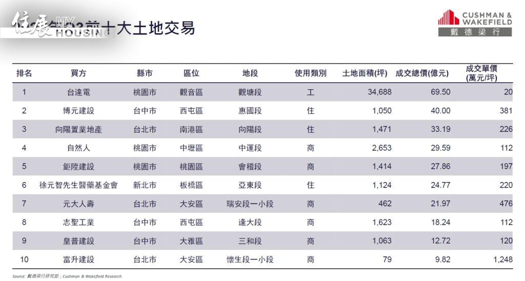 統計顯示,本季前10大土地交易中,台北市、台中市、桃園市各有3筆,新北市則有1筆。其中最大宗為台達電購入桃園市觀塘段土地,面積34,688坪,總價69.5億元。