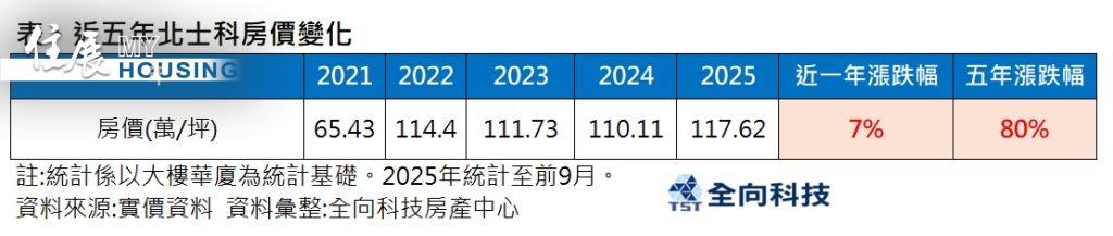 根據全向科技房產彙整實價登錄資訊,北士科近五年房價從每坪 6 字頭一路衝上三位數,累計漲幅高達八成;區域大樓平均單價已連續四年突破百萬元,顯示價位水準已與市中心差距明顯收斂。
