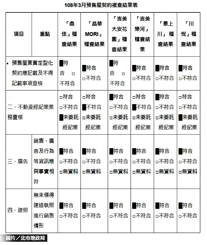 張治祥進一步表示,今年3月地政局共稽查富鉅鼎建設「鼎佳」、丹棠天津「晶華MORI」、吉美建設「吉美大安花園」、「吉美樂河」、東基開發「景上川」、志榮建設「川悅」等6個建案,查核項目分別為預售屋買賣定型化契約、不動產經紀業業務、廣告、建照等共27項,在契約、銷售廣告及取得建照後銷售部分6個建案皆符合規定;經紀業務查核部分,「晶華MORI」「吉美樂河」2個建案,代銷業未完成分設營業處所備查,已要求業者限期改正,而2案皆已於期限內完成改正。