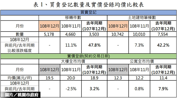 【住展房屋網/綜合報導】桃園市買賣移轉登記案件統計資料顯示,2019年12月買賣登記案件量共計5,178件,較前月增加518件,幅度約為11.1%;較去年同期增加1,675件,幅度約為47.8%;本月買賣移轉登記案件數明顯高於去年同期,且高於近一年月平均數(3,991件)。此外,2019年12月土地移轉筆數為6,276筆,建物棟數為4,466棟,合計總筆棟數10,742筆較前月10,010筆增加7.3%,及較去年同期7,554筆增加42.2%。