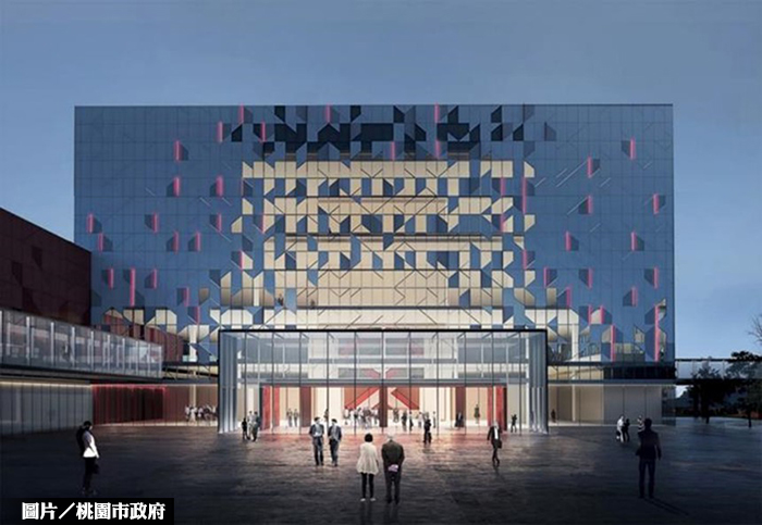 工務局長賴宇亭表示,桃園會展中心為中央和地方合作的重要開發案,規劃國際會議廳、國際展覽及服務設施等,結合周圍交通優勢,打造桃園首座國際性大型展覽及會議中心指標建築。外觀以陶淵明〈桃花源記〉為設計理念,強化外牆造型及燈光設計,白天陽光透過色彩玻璃,渲染建築物外牆,創造動態的立面效果;夜間則透過玻璃自發光,塑造夜間落英繽紛景象,以桃花及日光的交互作用,產生光影律動,呈現桃花林特色意象。