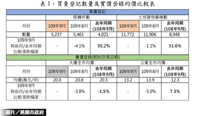 統計9月全市大樓及公寓交易均價,大樓為20萬元/坪,較前月20.8萬元/坪下跌3.8%,較去年同期20.3萬元/坪下跌1.5%;公寓為13.2萬元/坪,較前月13.9萬元/坪下跌5%,較去年同期(12.3萬元/坪)上漲7.3%。