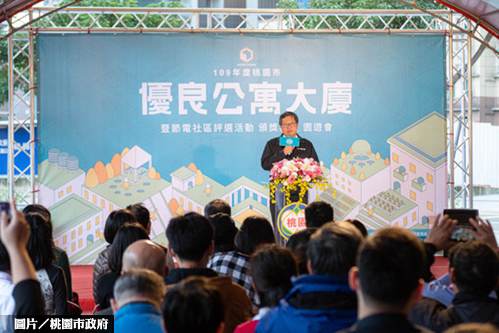 桃園市長鄭文燦為得獎社區頒獎,今年由「世界CBD大廈社區」、「桃大泰極社區」、「聯上世界社區」、「中悦音樂廣場社區」及「渴望村社區」,分別奪得「小型」、「中型」、「大型」社區、「風韻再造組」及「透天組」的冠軍。鄭市長說,得獎者要從6,000多個社區中脫穎而出,非常不容易,值得嘉許,能夠獲得「優良公寓大廈」的社區,不僅能提升居住環境品質、凝聚社區共識、營造良好鄰里關係,對於社區房價還有「抗跌」甚至「上漲」的附加價值。