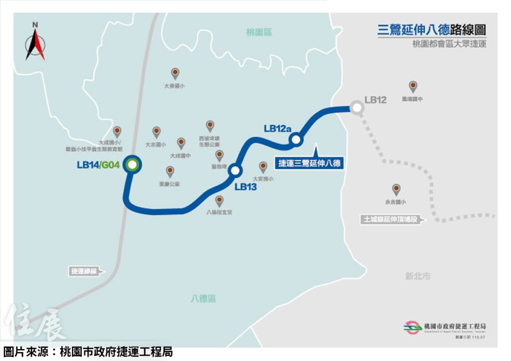 本計畫位於桃園市八德區,自三鶯線LB12尾軌起,沿福德一路、跨越國道2號大湳交流道後,利用和強路至介壽路新闢道路往西南行,沿都市計畫南緣至介壽路二段,再往北與桃園捷運綠線G04站銜接,全長約4.03公里,共配置3車站。(圖/桃園市政府捷運工程局)
