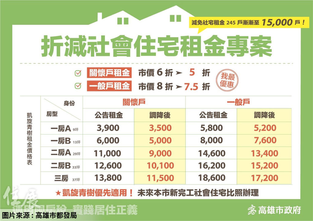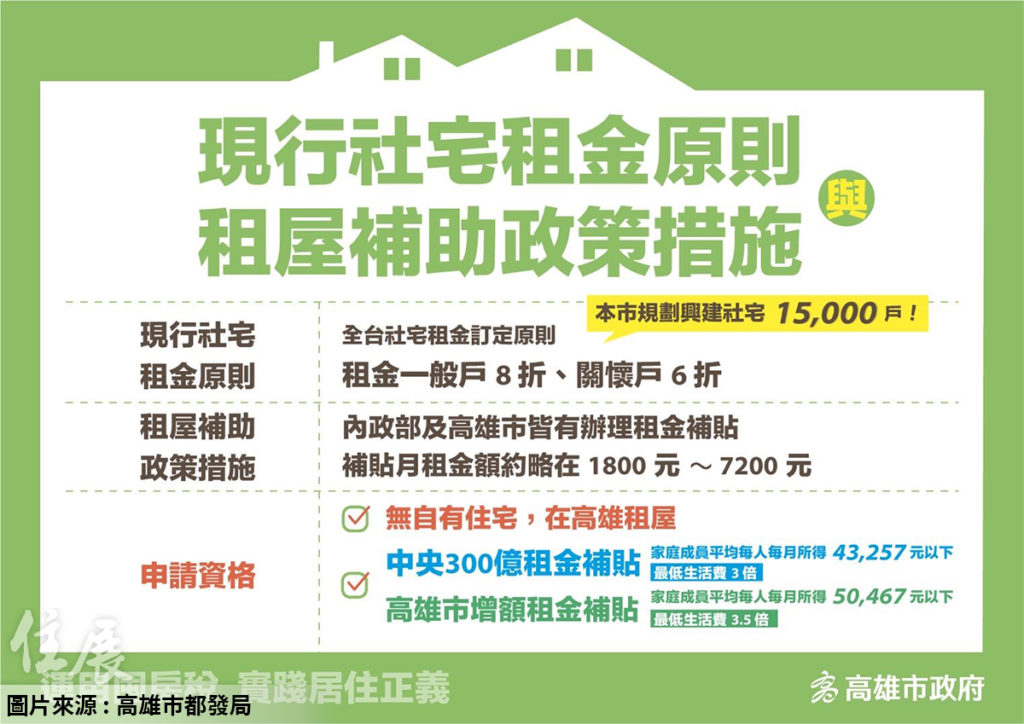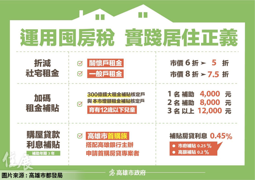 高市府提出折減社會住宅租金專案、加碼租金補貼支持育兒家庭、首購族購屋貸款利息補貼三大方案,實踐居住正義。