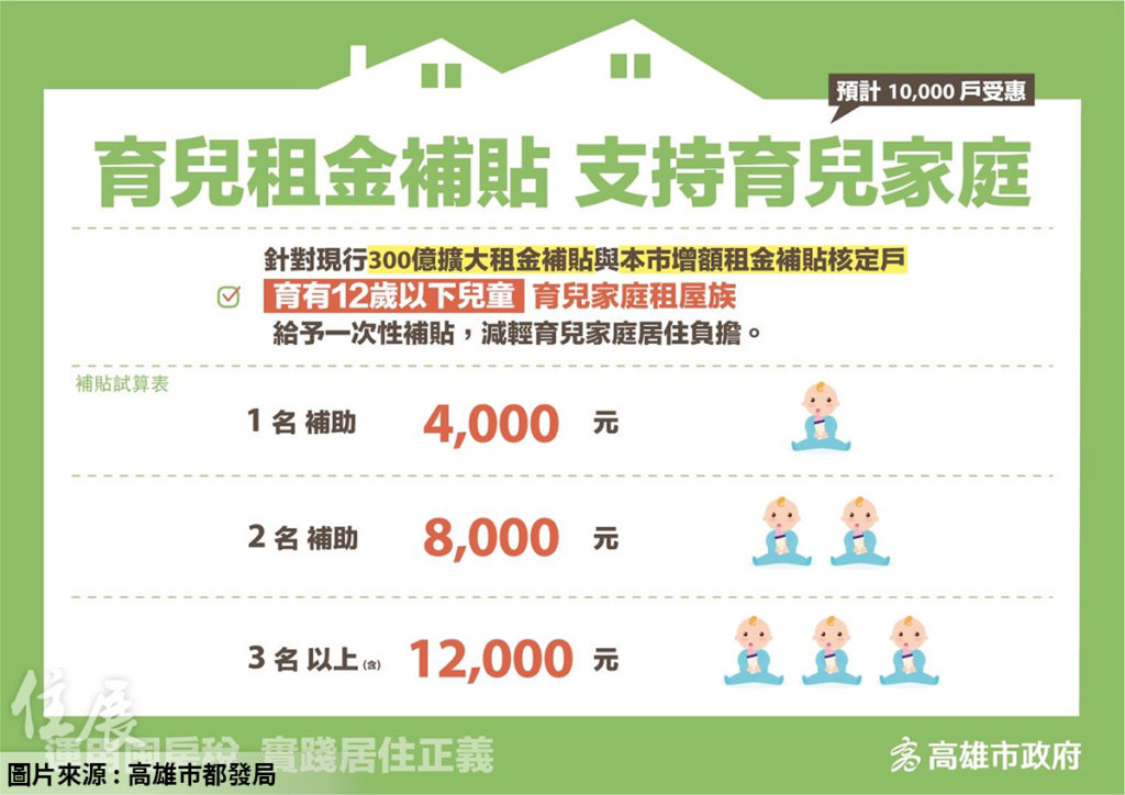 此外,為支持育兒家庭,市府也加碼給予育兒家庭一次性租金補貼,育有12歲以下兒童之家庭租屋族, 1名12歲以下子女給予4,000元租金補貼,2名給予8,000元,3名以上給予12,000元。