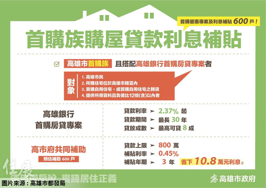 而考量近期利率調升,市府也規劃購屋貸款利息補貼,首購族搭配高雄銀行首購房貸專案者,貸款利率2.37%起,貸款上限800萬元,貸款期間最長30年,最高可貸8成;市府與銀行共同補助利率0.45%,市府補貼利率1碼0.25%,補貼年期3年,預估有600戶可受惠。