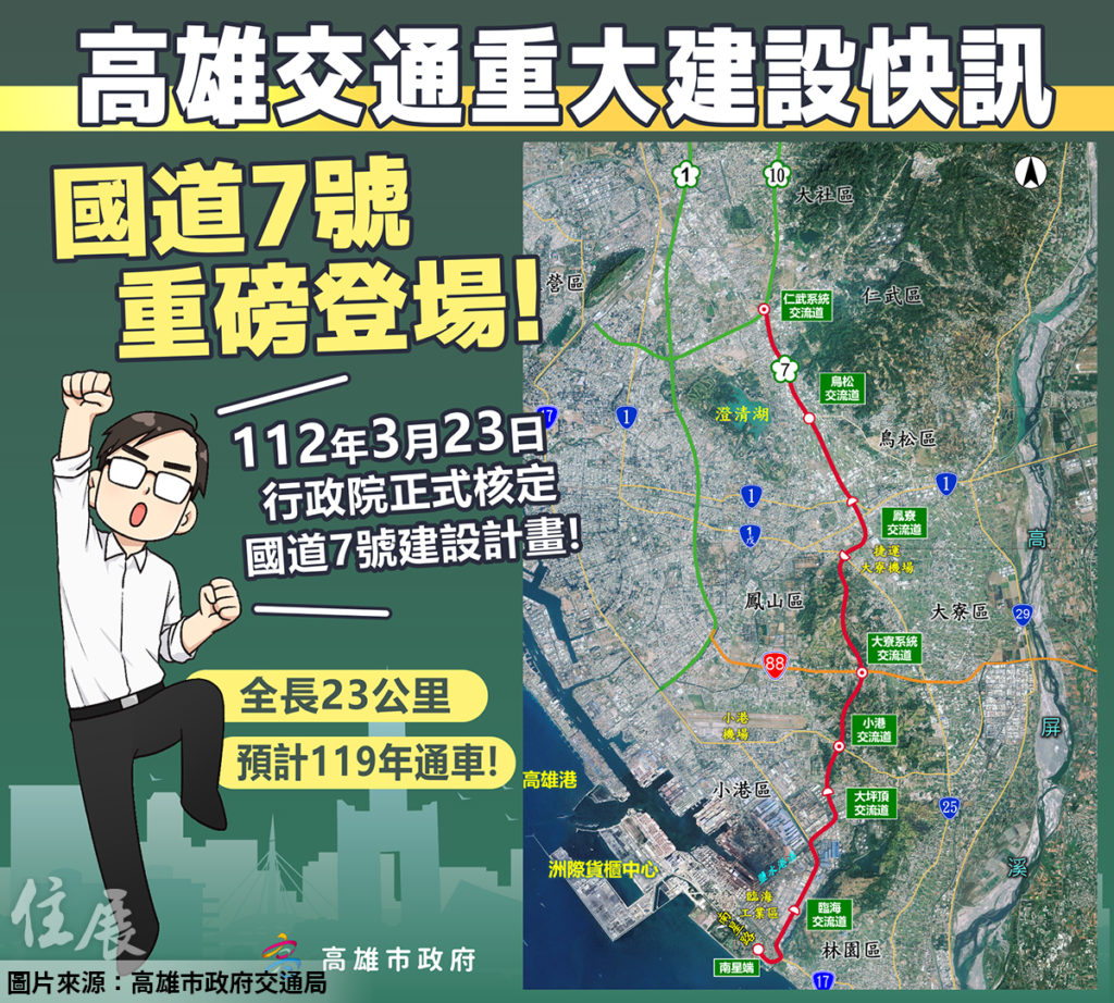 期盼15年,國道7號正式在昨(23)日獲行政院核定!總經費約1,357.9億元,未來高雄市區東側將新增1條南北向高速公路,提供高雄港洲際貨櫃中心便捷聯外,路線由小港南星路一路往北至國道10號仁武,2025年動工,2030年完工,分標施工、分階段通車。