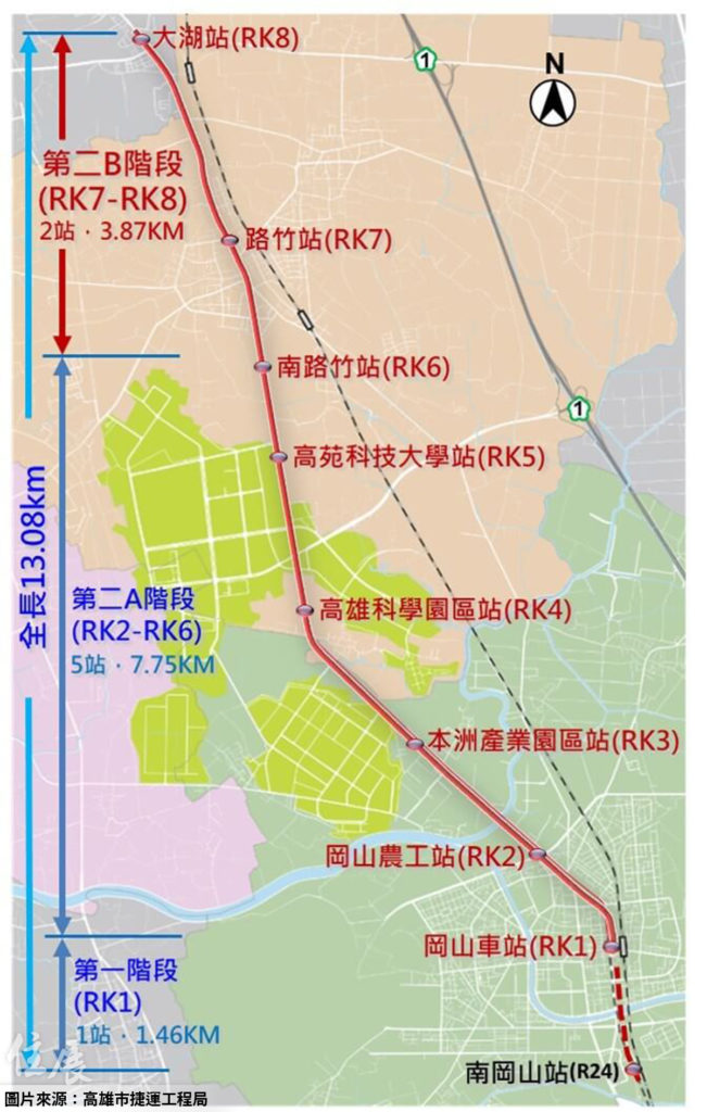 捷運局表示,市府積極推動岡山路竹延伸線不遺餘力,在行政院長陳建仁及中央各部會的支持下,正式核定岡山路竹延伸線二B階段綜合規劃報告,也確定捷運延伸至湖內區。市府已同步啟動設計作業,朝2029年底前通車之目標邁進。