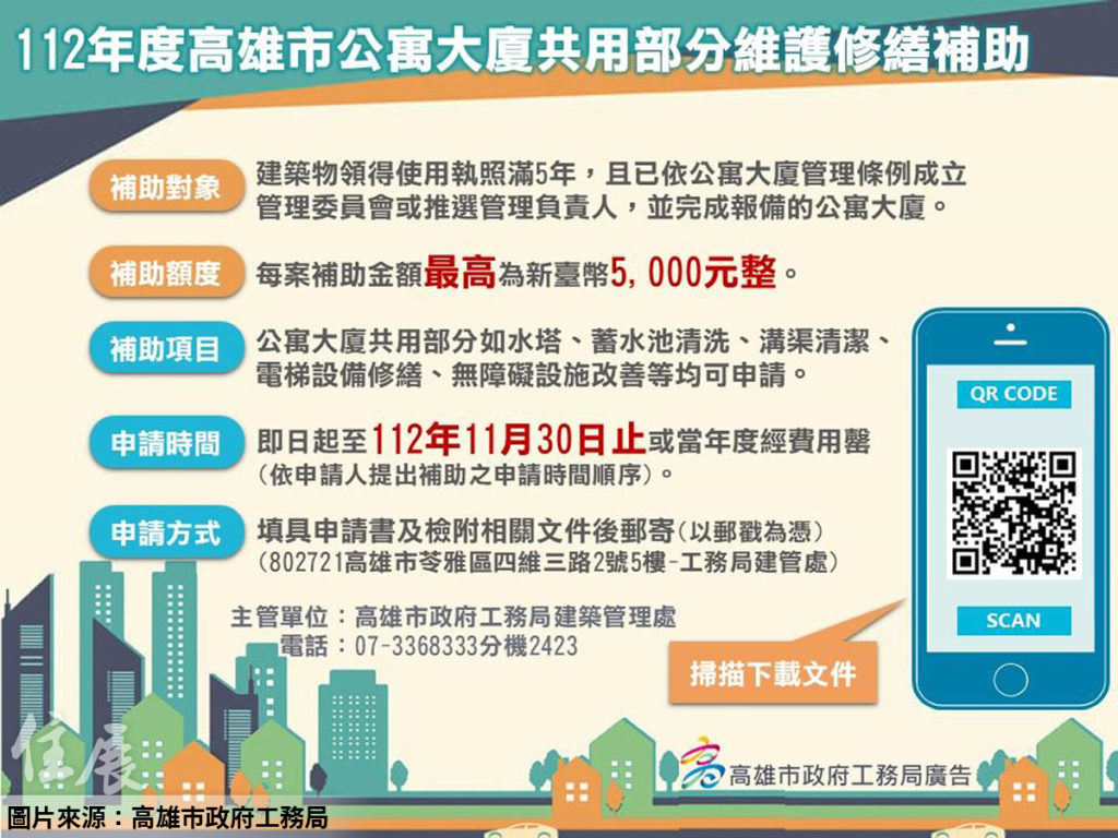 為協助社區對老舊公共設施的維護及修繕並增進大樓設備安全,高雄市工務局已公告提供社區大樓共用部分補助申請,每棟大樓補助金額最高為新臺幣5,000元,只要是屬於大樓共用部分,如電梯、外牆、水塔、溝渠等,均可申請修繕補助,受理期限至11月30日截止,觀迎大樓踴躍提出申請。