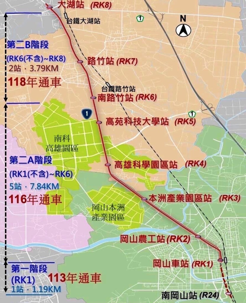 捷運岡山路竹延伸線RK1站到RK6站路線圖,圖片高雄市政府捷運局提供